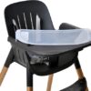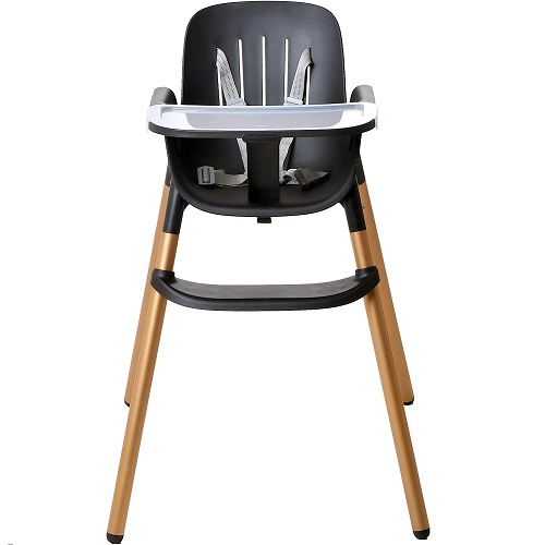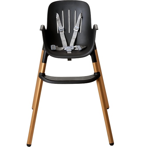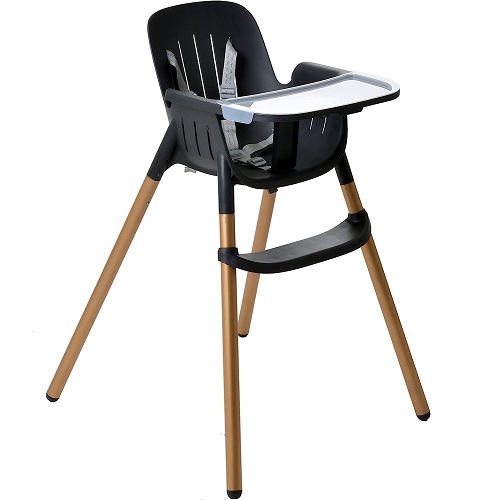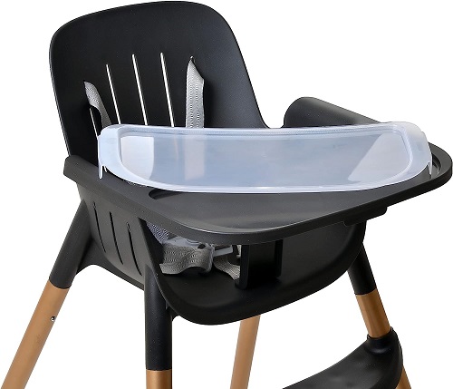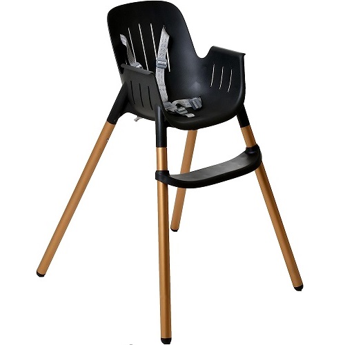 Ela possui cinto de segurança de 5 pontos, bandeja e sobrebandeja removíveis, com apoio para os pés e entrepernas.