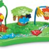 Na floresta tropical, seu pequeno vai se encontrar com 3 insetos giratórios, um sapo e lagartixa com controles deslizantes, um papagaio bamboleante e um aramado com macaco e bananas que deslizam ao movimentar os dedinhos.