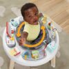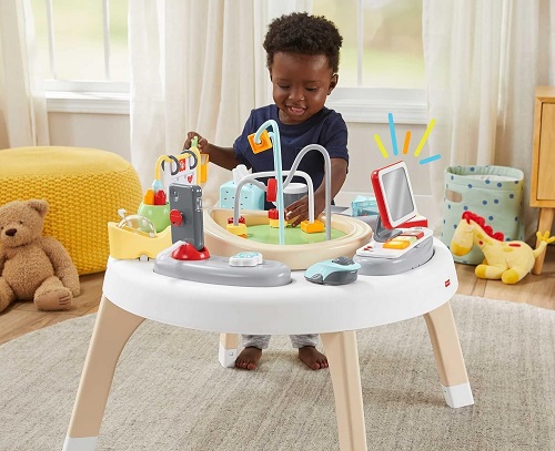 Seu bebê tem tudo o que precisa para um dia produtivo em casa. Por isso, com o crescimento do seu bebê, substitua o assento por uma barra de argolas com chocalho para transformar o centro de atividades para bebês em uma mesa de criança pequena para brincar em pé.