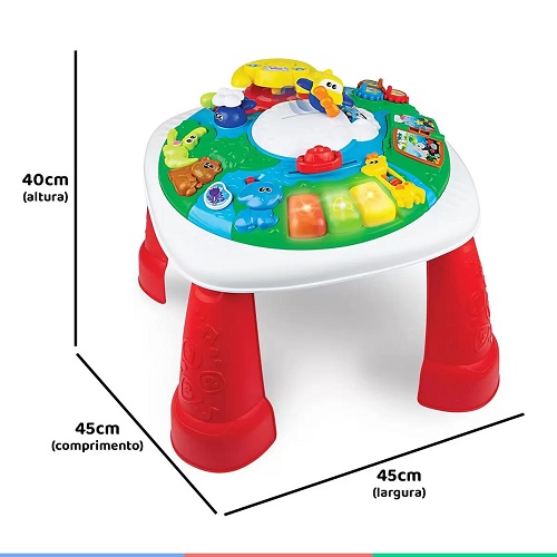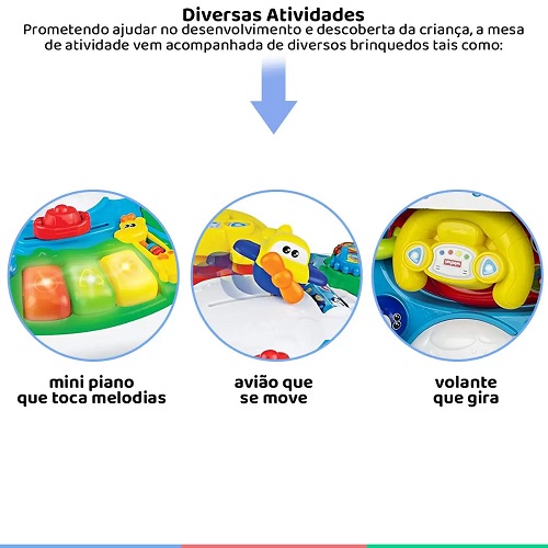 Nesta mesa de atividades interativa, cada detalhe convida para uma nova aventura. Ao pilotar o avião, a criança escuta sons realistas e imagina voos entre as nuvens ☁️✈️.